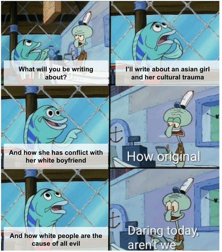 Circling back to WMAF authors — regardless of the author’s relationship status, building a story on the low hanging fruit of White microaggressions is not the same thing as building a story on Asian, or non-White relationships or friendships or conflicts or resilience.